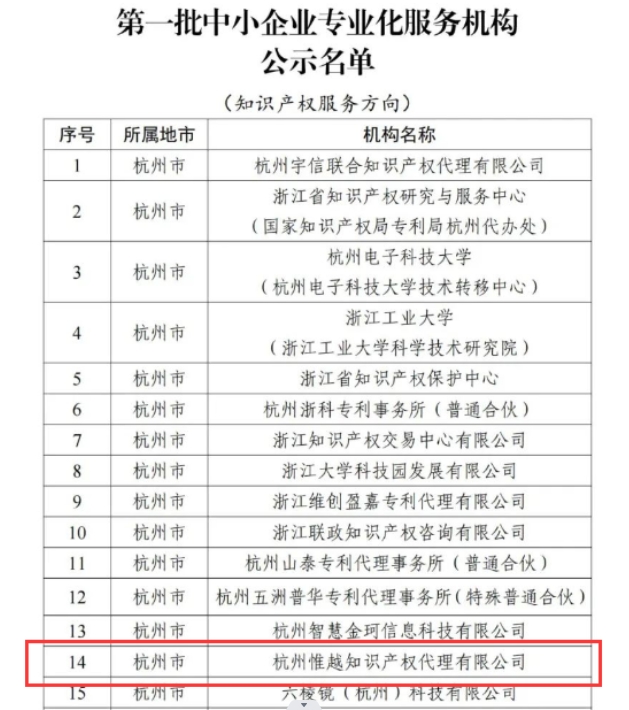 • 喜報?。£P于杭州惟越知識產權代理有限公司入選浙江省首批中小企業專業化服務機構的公示